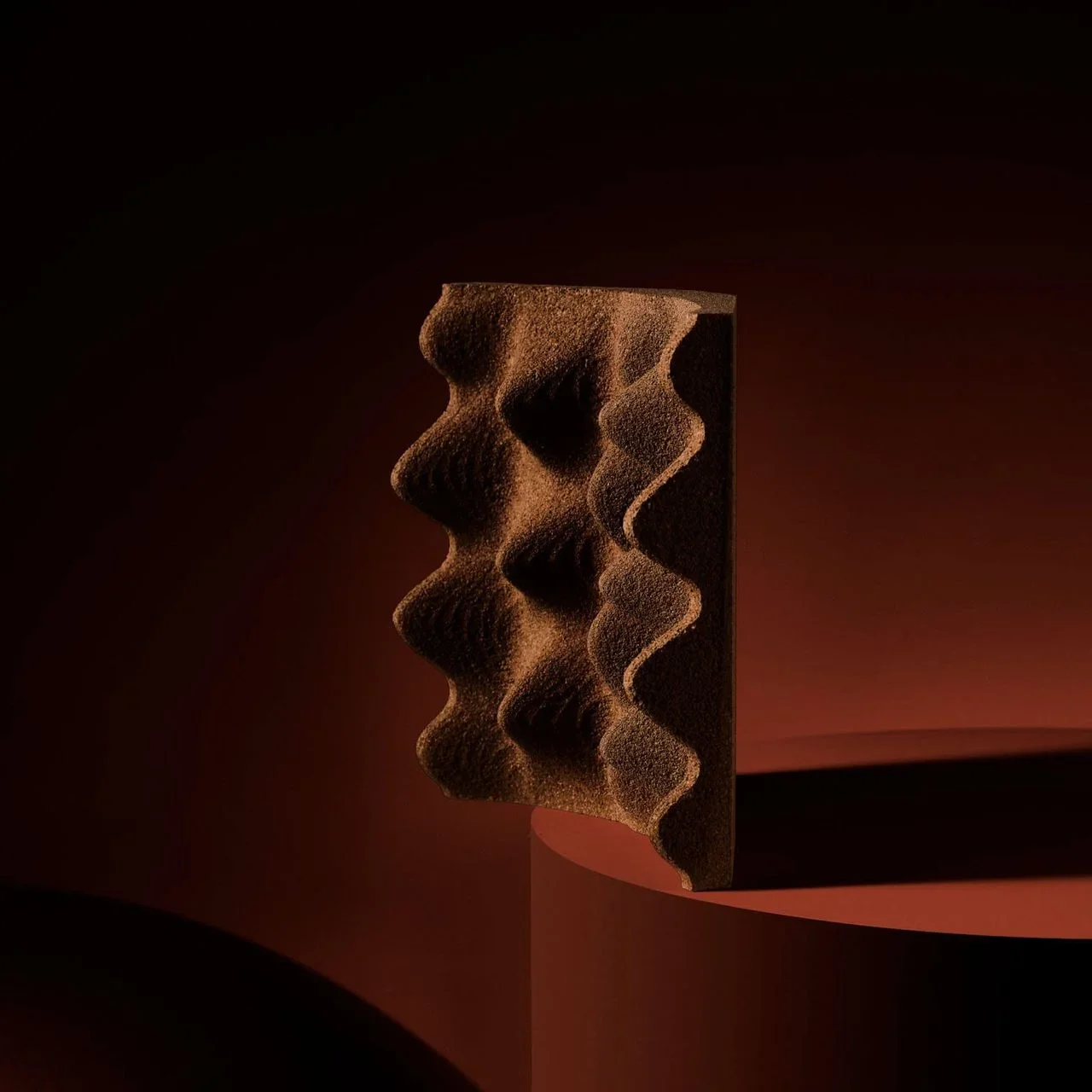 Cette surface en liège est élaborée grâce à la simulation informatique, mais le résultat final reste d’une forme véritablement organique : sans régularité géométrique et réalisée à partir d’un matériau totalement naturel et durable.